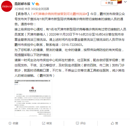 接上级疾控中心通知,有1名与天津市新型冠状病毒确诊病例有过密切接触的人员吕某某(天津市静海人)2020年11月20日下午14点25分至16点04分曾在我市辛章金碧泉洗浴三楼洗浴。请上述时间内在辛章金碧泉洗浴三楼洗浴的人员尽快与霸州市疾控中心联系,联系电话:0316-7220603。